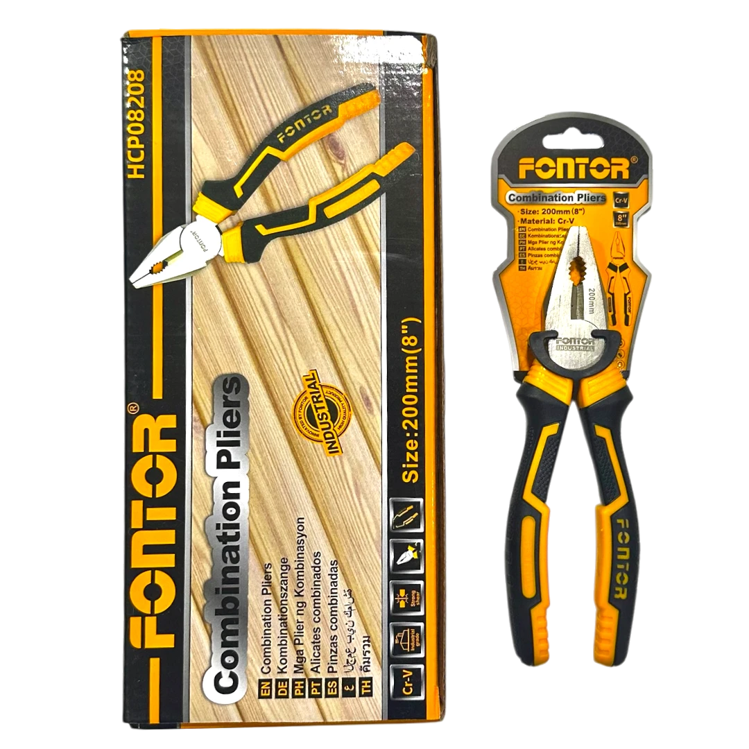 Alicate combinado Fontor #8 fabricado en acero cromo vanadio (Cr-V), con mango ergonómico antideslizante. Ideal para corte, sujeción y torsión.