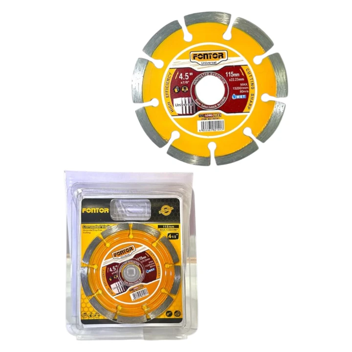 El disco diamantado segmentado 4 1/2 pulgadas Fontor es un disco de corte profesional diseñado para trabajos exigentes de corte en concreto, bloque, ladrillo, piedra, cerámica y materiales de mampostería.