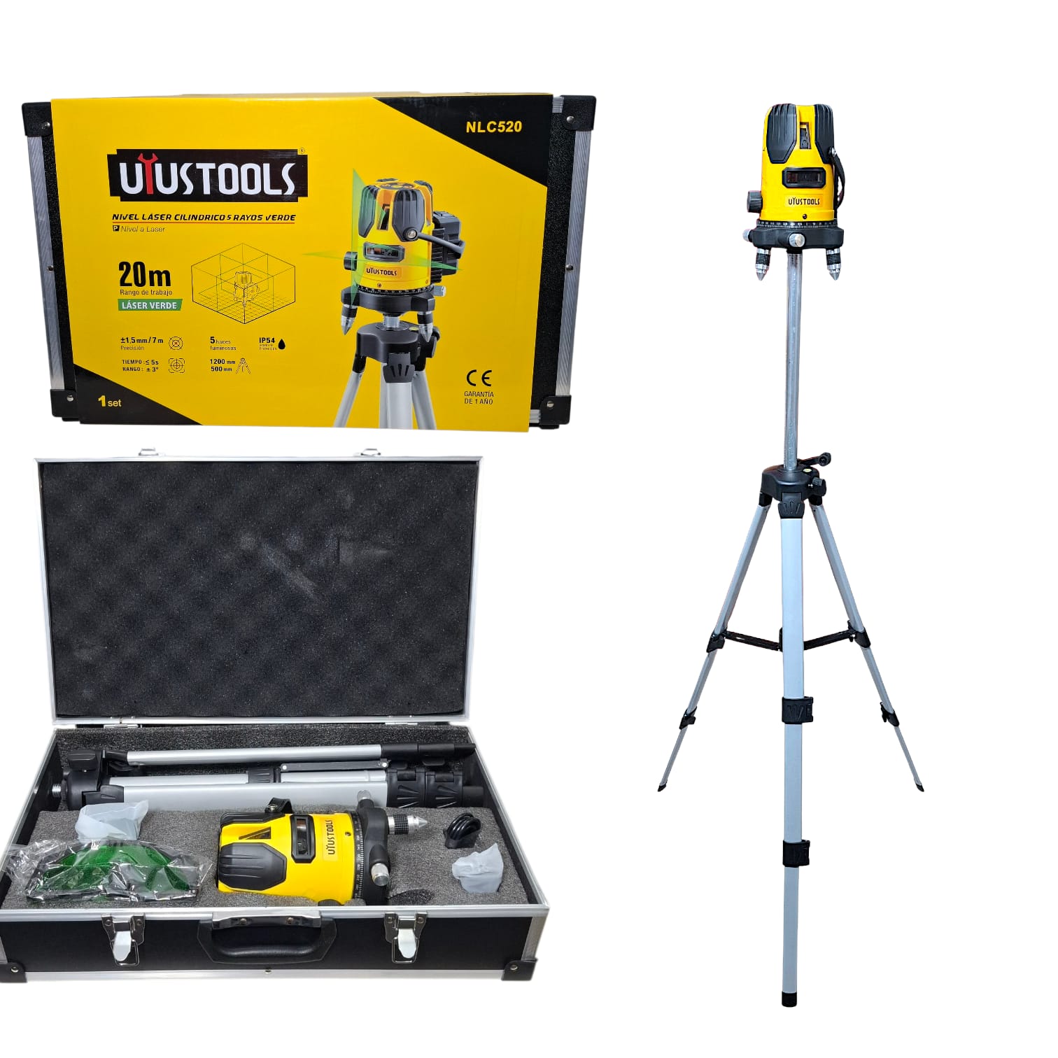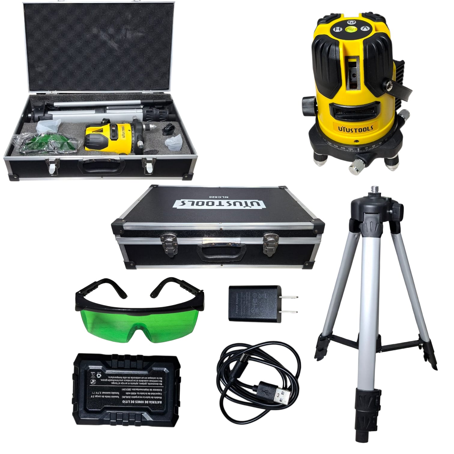 Nivel láser Uyustools recargable. Proyección 360°, incluye trípode, maletín, batería y accesorios. Precisión profesional para construcción y acabados.