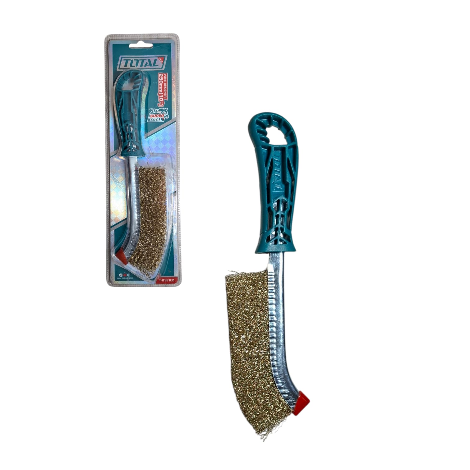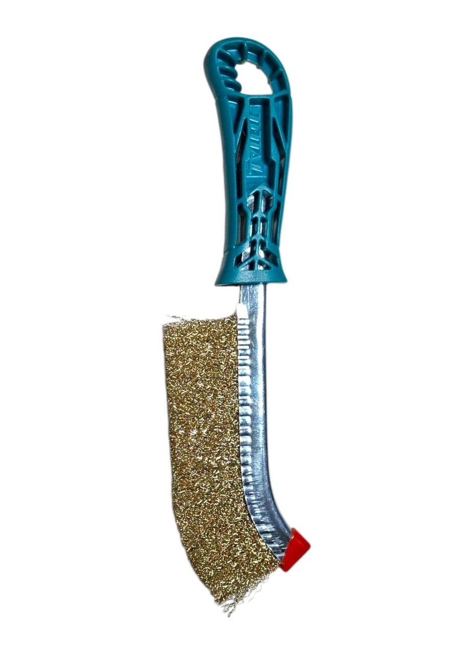 El cepillo de alambre Total es una herramienta práctica y resistente, diseñada para trabajos de limpieza profunda en metal y superficies rústicas. Su forma curva permite mayor precisión en zonas difíciles, mientras que el mango ergonómico asegura un agarre cómodo y seguro durante su uso.