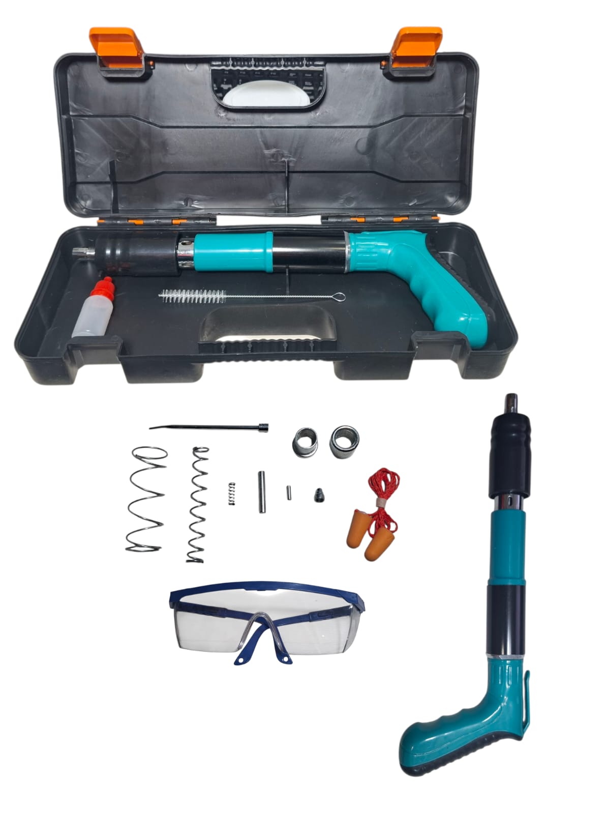 Pistola de fijación a pólvora con estuche rígido. Incluye accesorios de seguridad y repuestos. Ideal para construcción, anclajes y fijaciones rápidas.