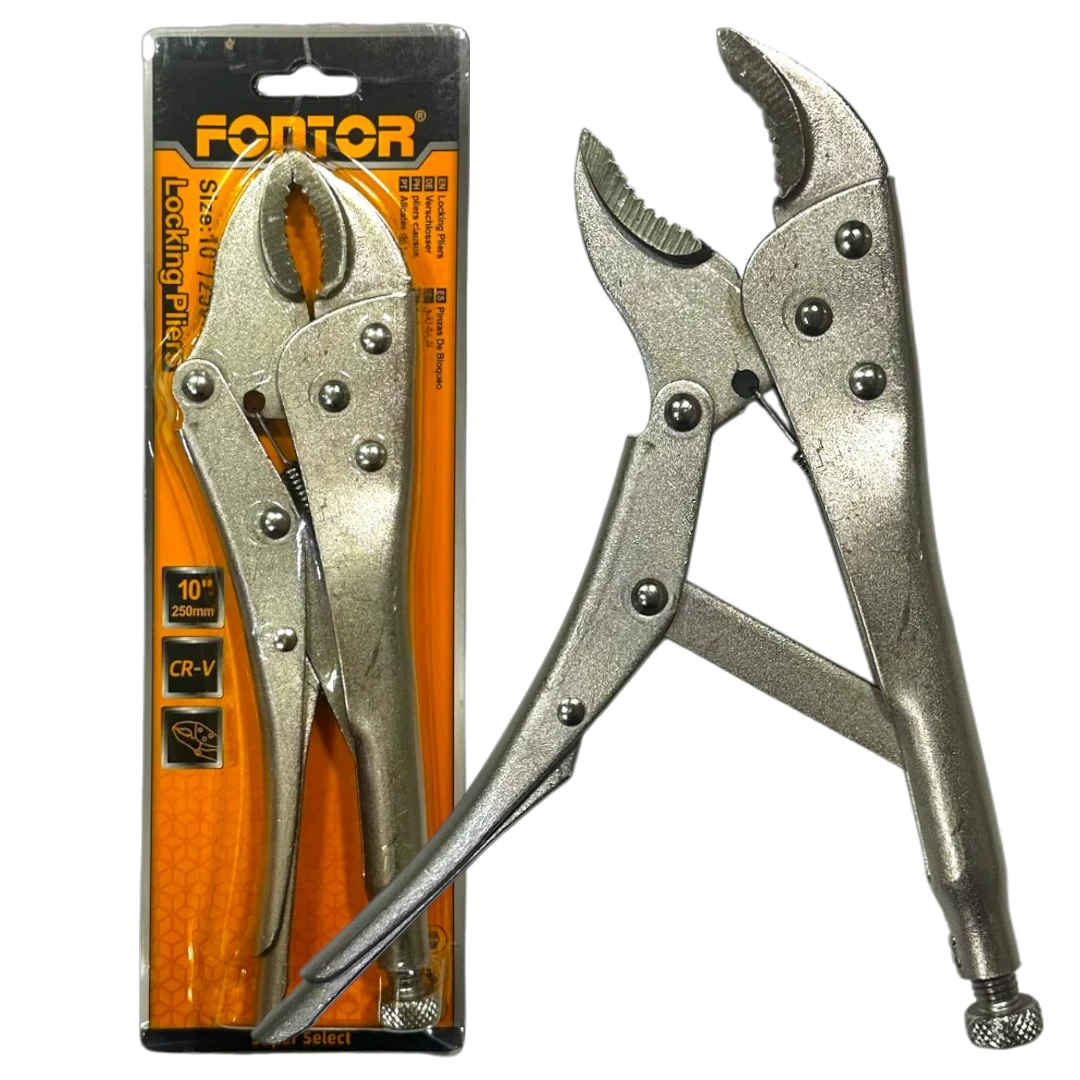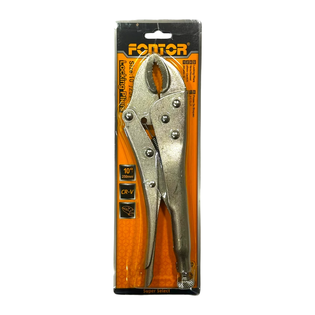 Alicate de presión Hombre Solo Fontor de 10 pulgadas en acero CR-V. Firme, resistente y ajustable para trabajos mecánicos, industriales y domésticos.