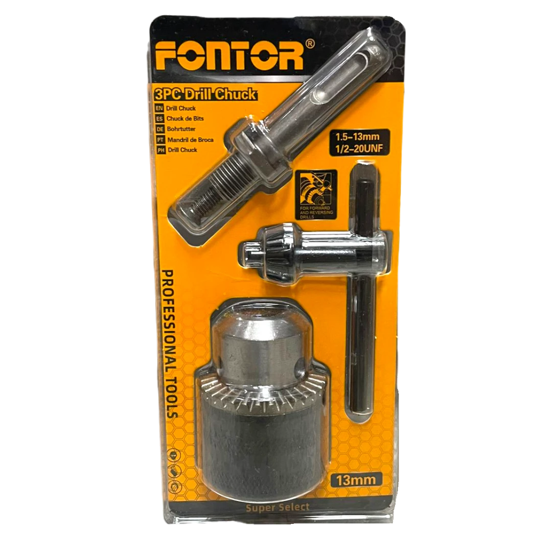 El mandril para taladro con acople para rotomartillo Fontor 1/2” es un accesorio profesional diseñado para convertir rotomartillos con sistema SDS en taladros convencionales, permitiendo el uso de brocas cilíndricas estándar.