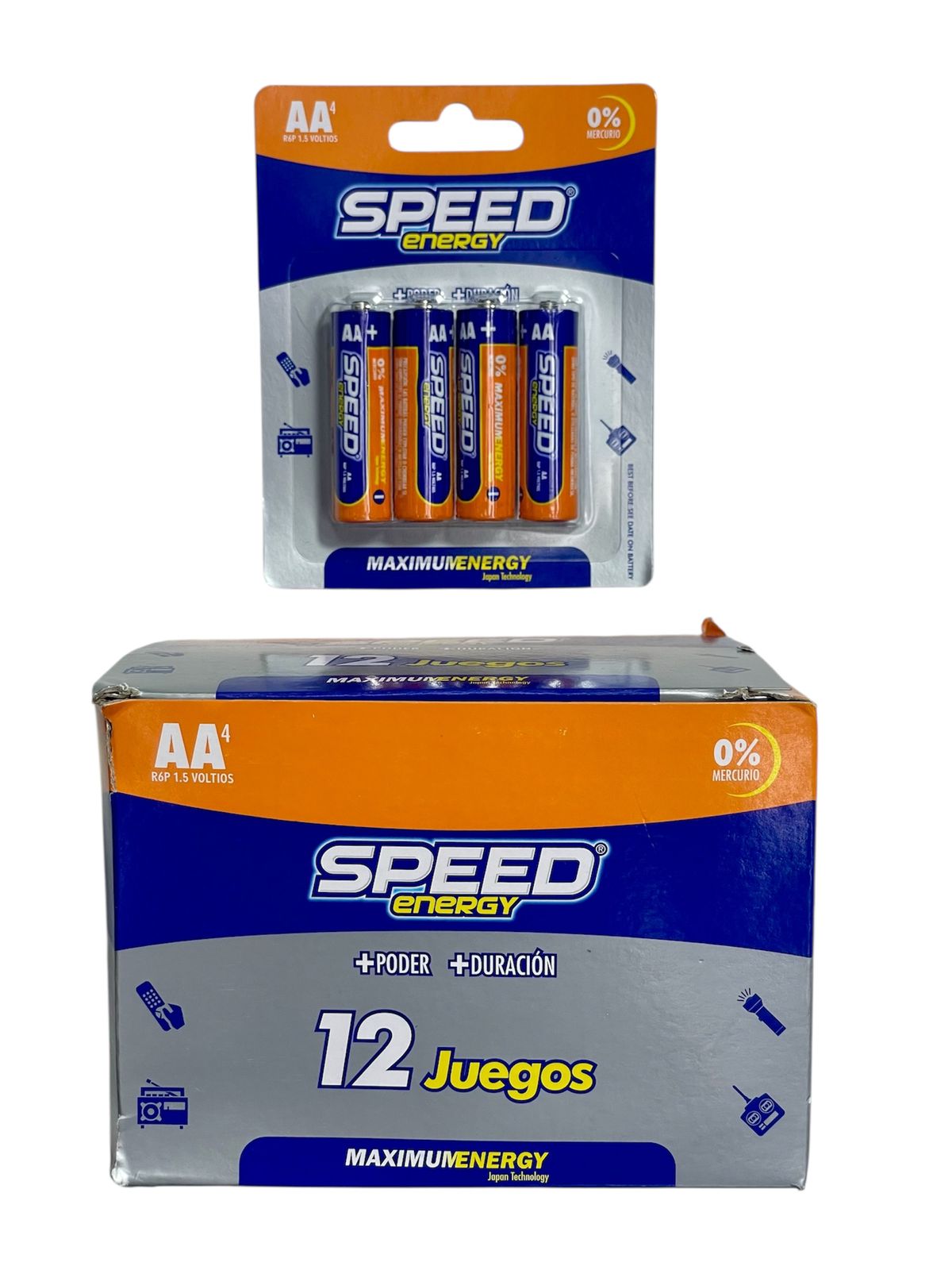 Pilas AA Speed Energy de 1.5V. Pack con 12 juegos (48 pilas). Potencia y duración ideales para controles, radios, linternas y dispositivos electrónicos.