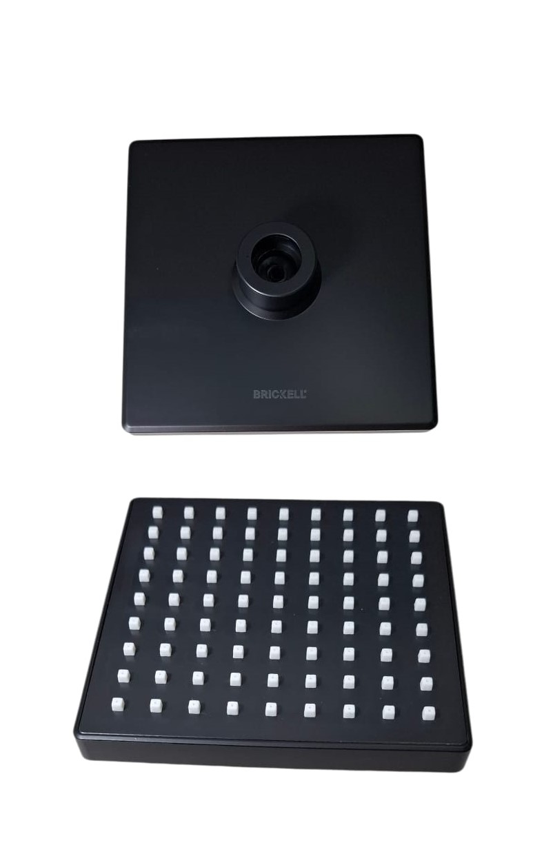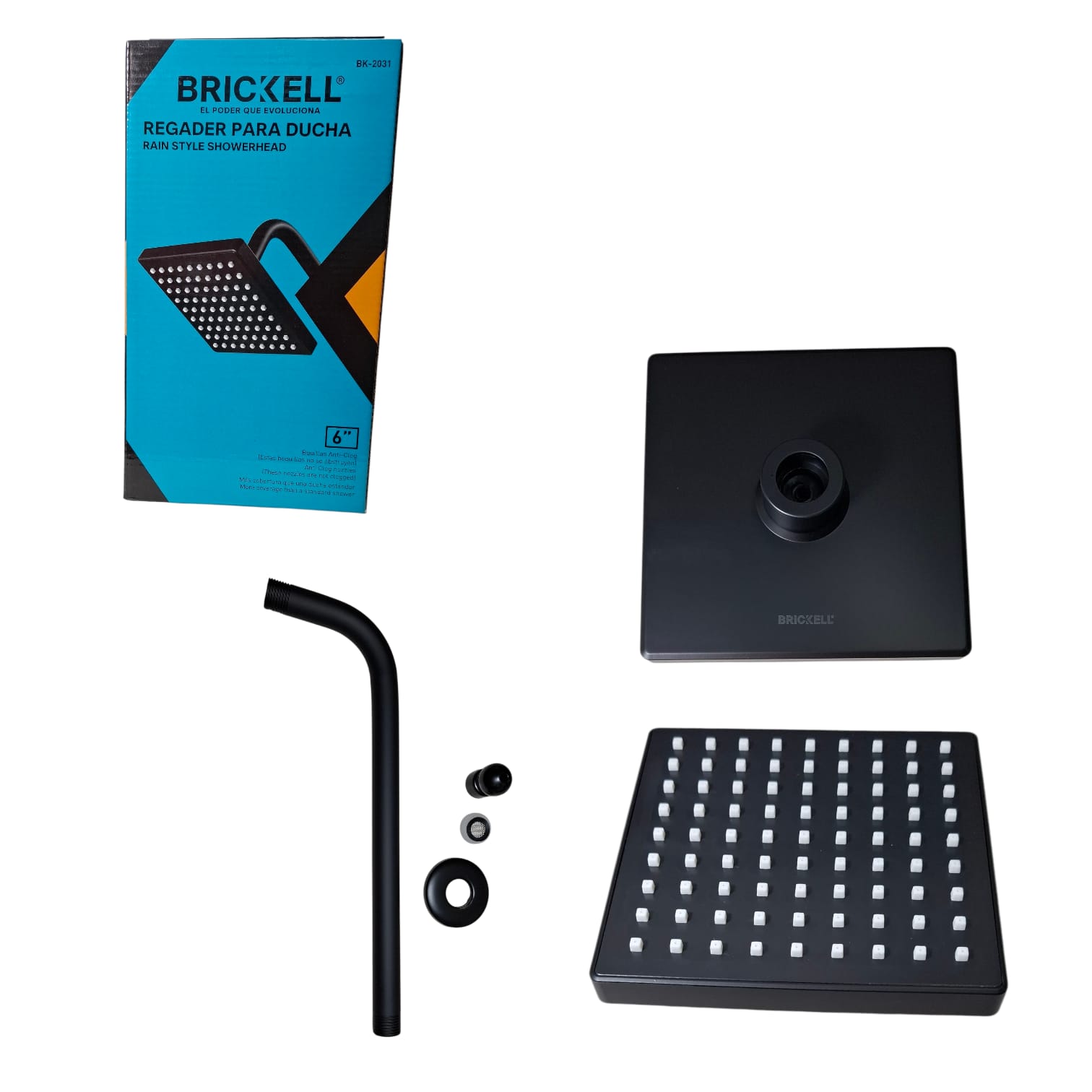 Regadera Brickell 6” estilo lluvia en color negro mate. Diseño moderno, fácil de instalar y con caída de agua uniforme para mayor comodidad en la ducha.