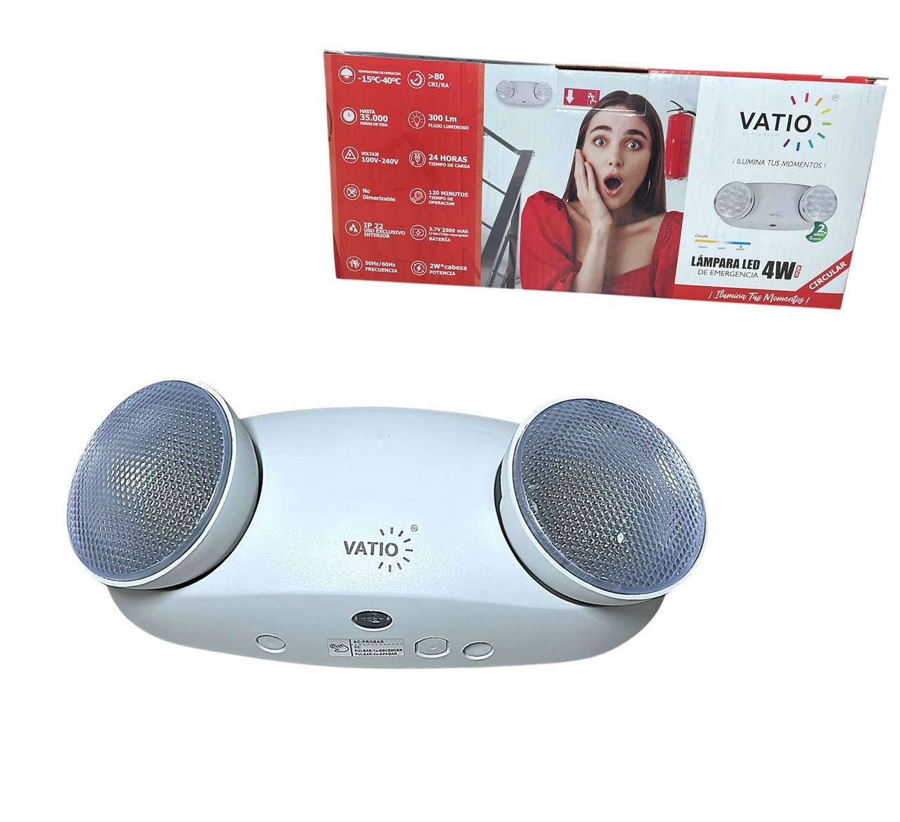 La lámpara LED de emergencia Vatio de 4W ofrece iluminación confiable durante cortes eléctricos. Con dos cabezales circulares ajustables, batería recargable y encendido automático, es ideal para hogares, oficinas, escaleras, hospitales y más.